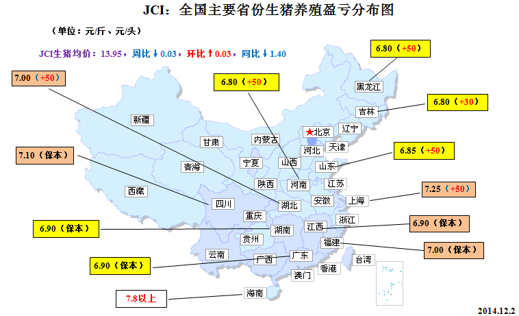 來自中國農(nóng)業(yè)部最新發(fā)布的統(tǒng)計報告--《2014年11月第2周(總第46周)畜產(chǎn)品、飼料集市價格》顯示,截至11月12日,全國生豬市場均價在14.10元/公斤,仔豬均價為21.51元/公斤,豬肉均價為23.19元/公斤,較10月均值分別下跌2.22%、8.19%和1.75%。盡管11月份我國生豬、仔豬和豬肉(白條肉)市場價格呈現(xiàn)全面回調(diào)格局,但是由于國內(nèi)豆粕、玉米包括相關(guān)飼料原料成本近來明顯回落,生豬價跌勢相對于飼料成本降幅較為溫和,全國大多數(shù)地區(qū)的養(yǎng)殖戶(場)仍然維持保本或微利狀態(tài)。如前文所述,進(jìn)入12月份我國生豬市場依然存在需求推動型的反彈空間。